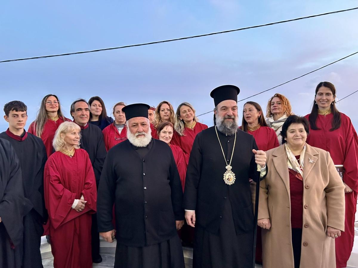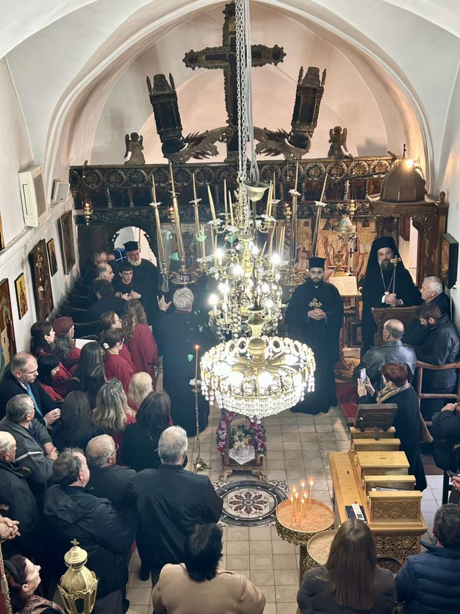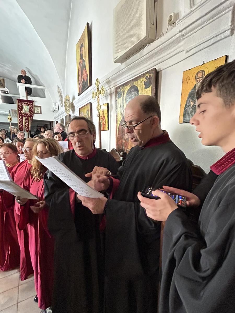 Το ιερό αναλόγιο διακόνησαν ο Διευθυντής της Σχολής Βυζαντινής Μουσικής της Ιεράς Μητροπόλεως κ. Ευτύχιος Μαρκοζάννες και μαθητές της Σχολής.